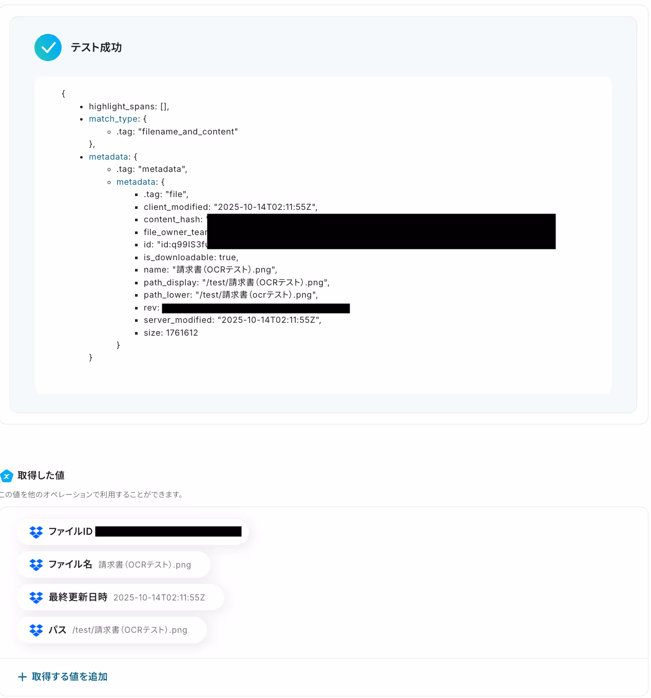 テストに成功すると、Dropboxに作成された新しいファイルに関する情報が一覧で表示されます。