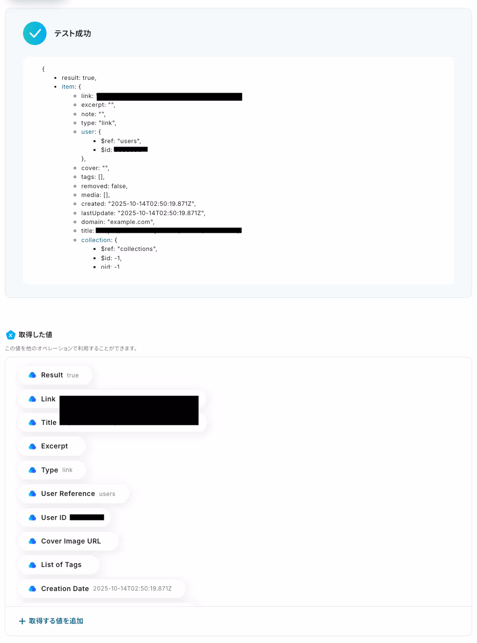 なお、テキストを直接入力した部分は固定値とされるため、取得した値を活用せず設定を行うと毎回同じデータがRaindrop.ioに登録されてしまうので注意が必要です。