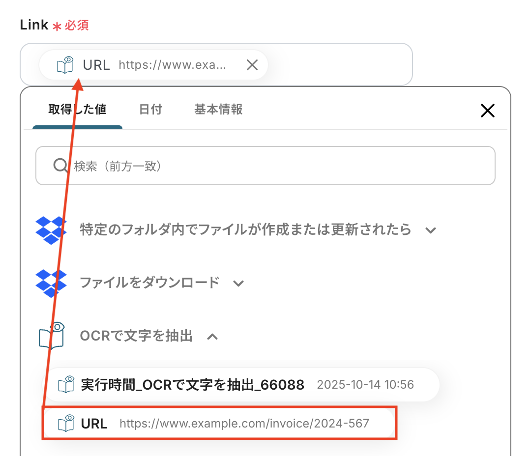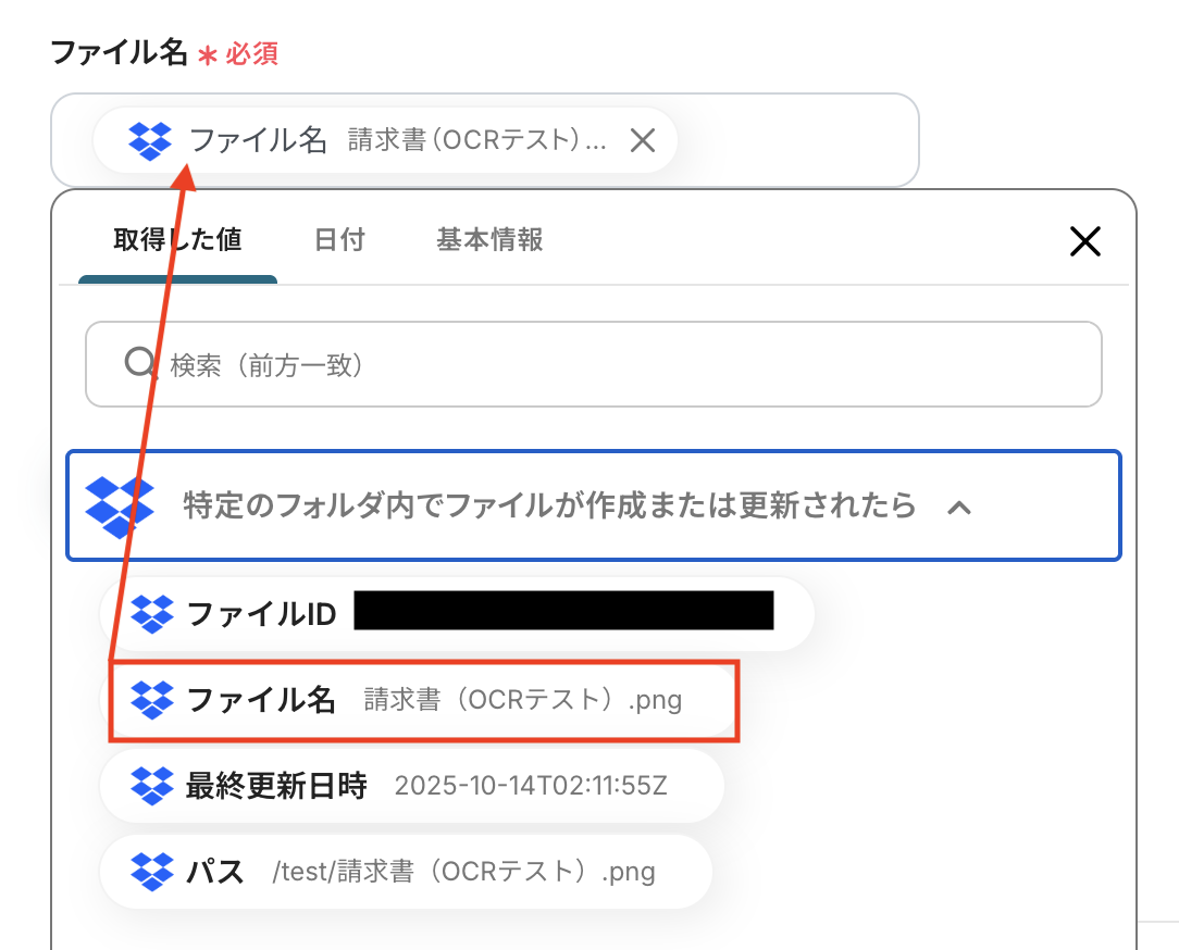 ファイル名 入力欄をクリックすると、前のステップでDropboxから取得した値が表示されるので、選択して入力しましょう。 取得した値を活用することで値が固定化されず、フローボットを起動するたびに最新の情報を自動で反映できます。