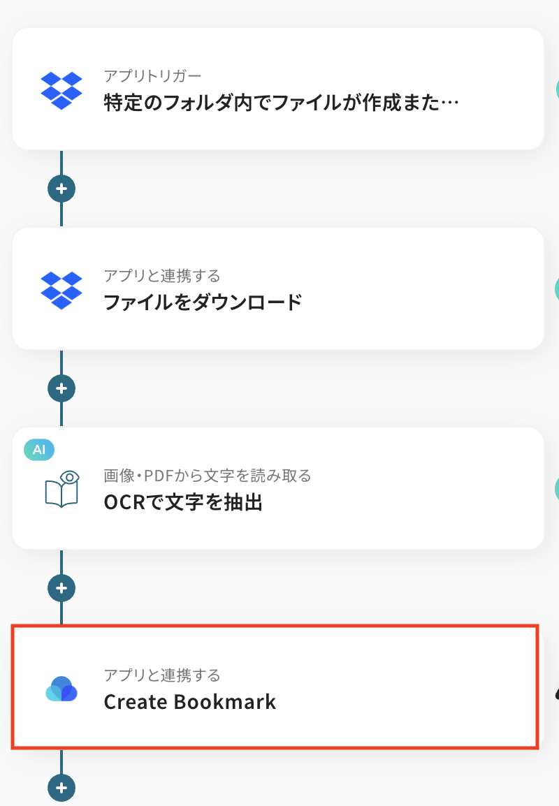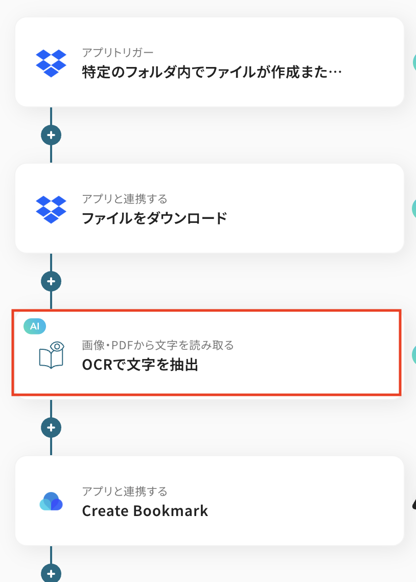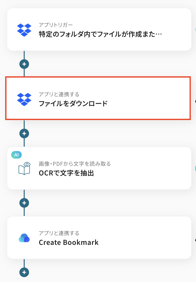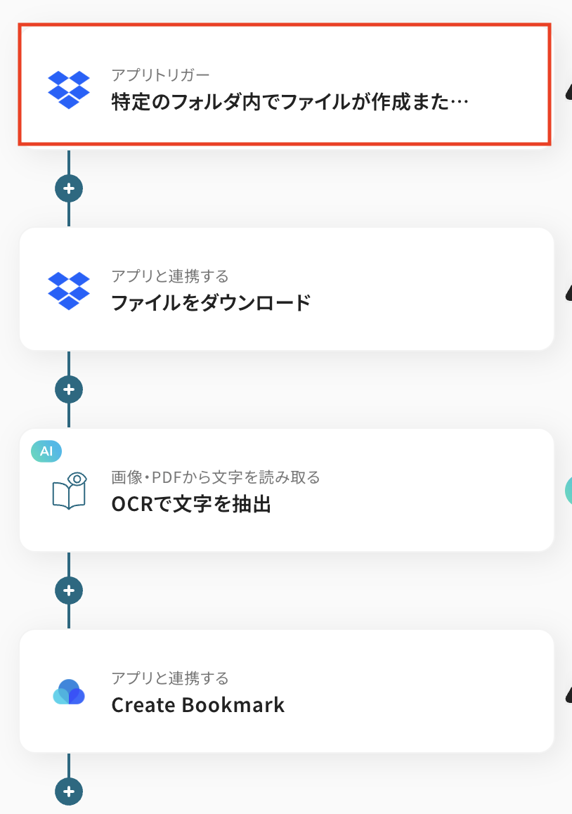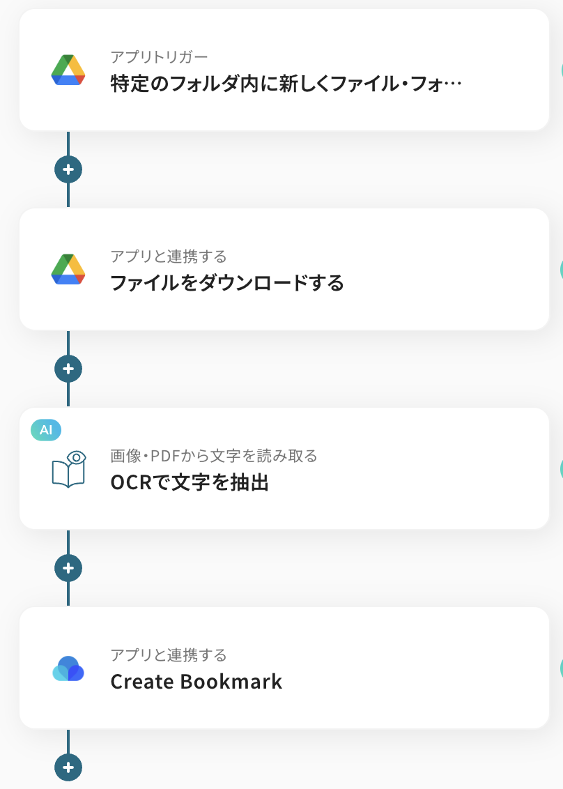 まず、Google Driveのトリガーアクション「特定のフォルダ内に新しくファイル・フォルダが作成されたら」を設定します。 その後、「ファイルをダウンロードする」→「OCRで文字を抽出する」→「Raindrop.ioでブックマークを作成する」 という順にアクションを設定すれば、Dropboxの場合と同じ流れでフローが動作します。(以下画像参照)