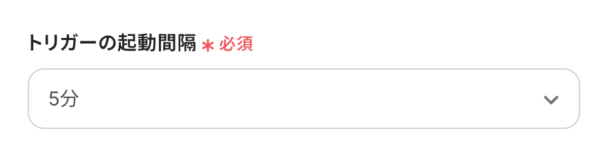 トリガーの起動タイミングは、5分、10分、15分、30分、60分のいずれかで設定できます。ご利用プラン によって、設定できるトリガーの最短間隔が異なるため、その点は要チェックです。 なお、基本的にはそのプランの最短の起動間隔にしてお使いいただくことをおすすめします。