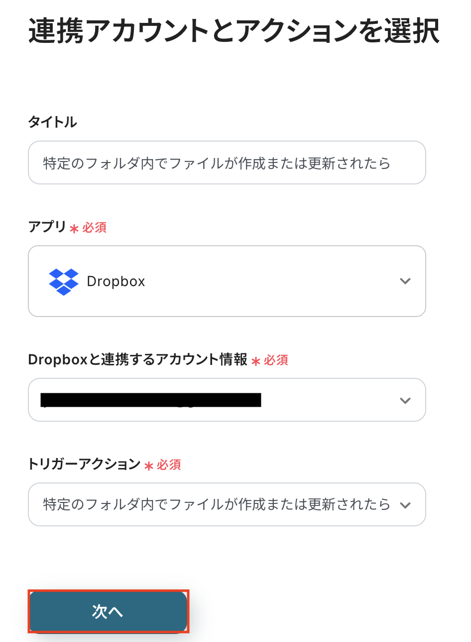 Dropboxと連携するアカウント情報に問題がなければ、「次へ」をクリックします。