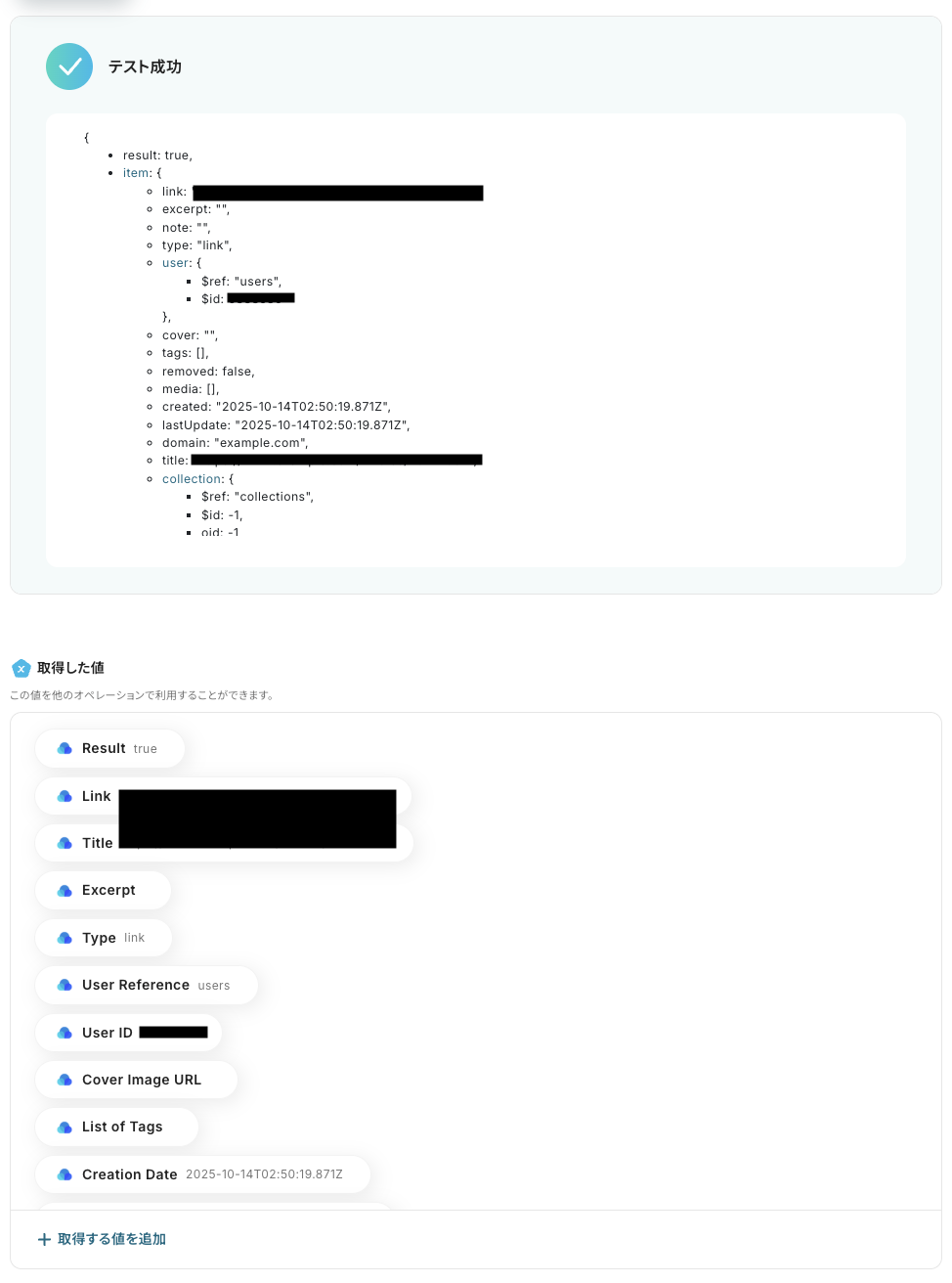 テストに成功すると、OCR機能によってダウンロードしたファイルから読み取られた情報が表示されます。 以下の画像の取得した値を使用して、Raindrop.ioへブックマークの作成が可能です。