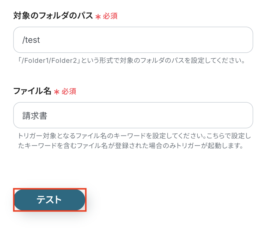 入力が完了したら、設定内容とトリガーの動作を確認するため「テスト」をクリックします。