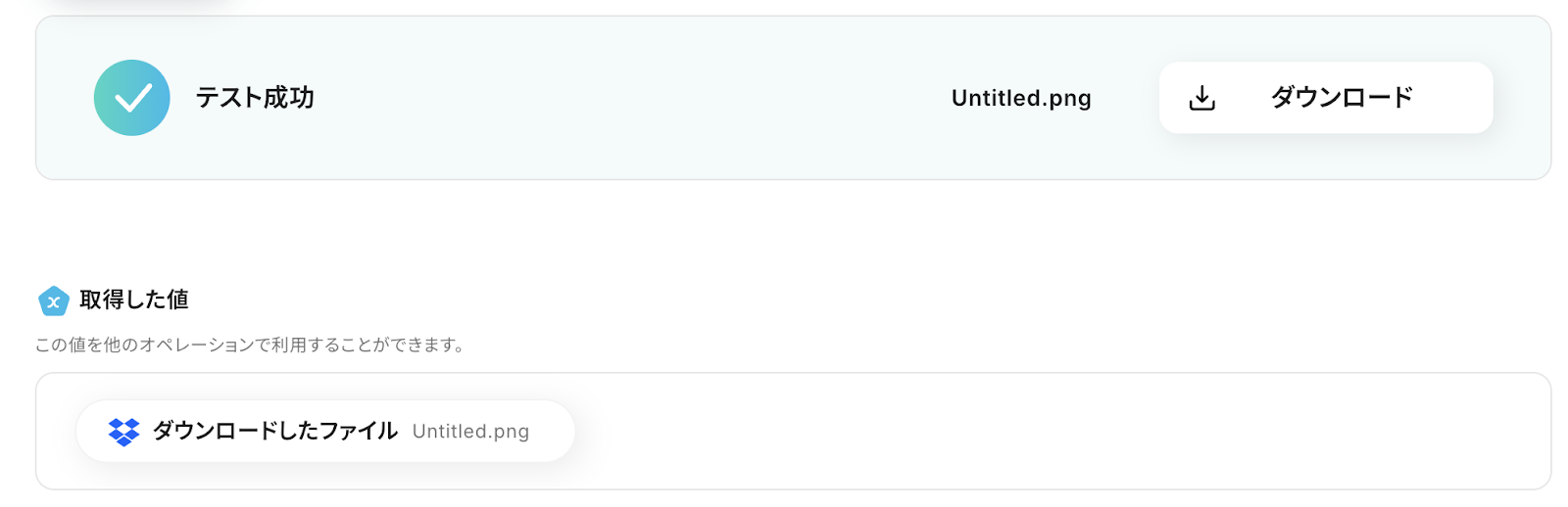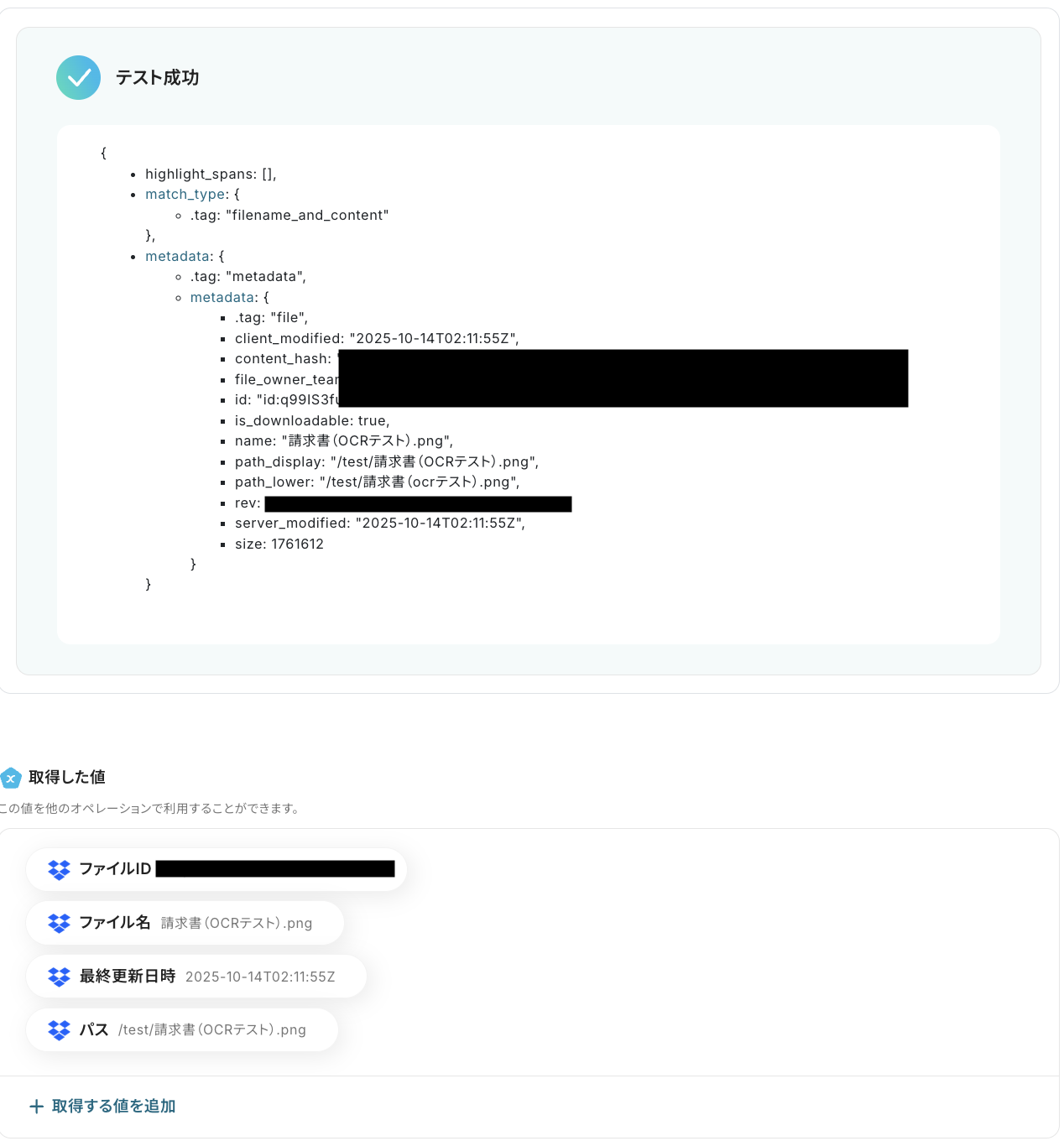 テストに成功すると、Dropboxに作成された新しいファイルに関する情報が一覧で表示されます。 こちらの画像の取得した値はこの後のステップで利用することができます。