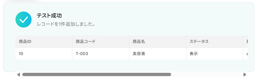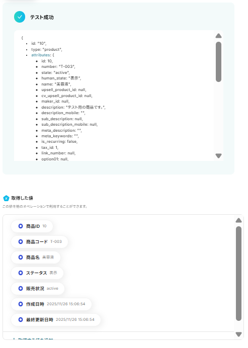テストが成功すると、取得した値の各項目の横にecforceに登録した商品の詳細情報が表示されます。