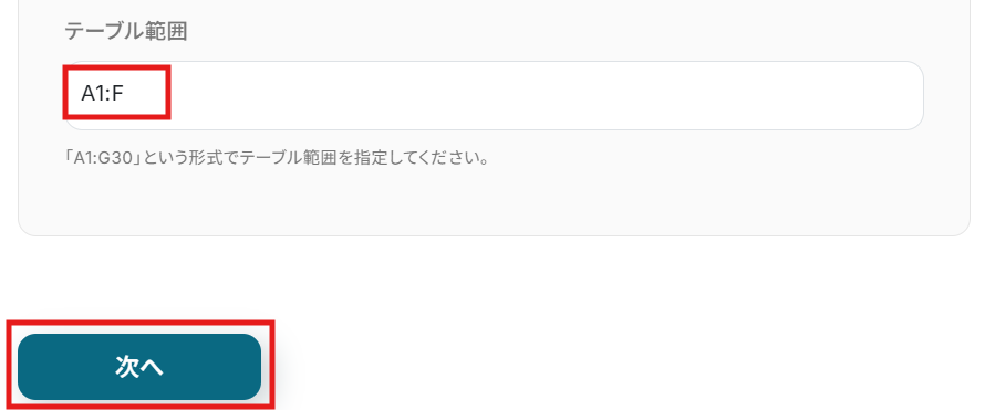 更新したいデータが記載されているテーブル範囲を任意で入力し、「次へ」をクリックします。