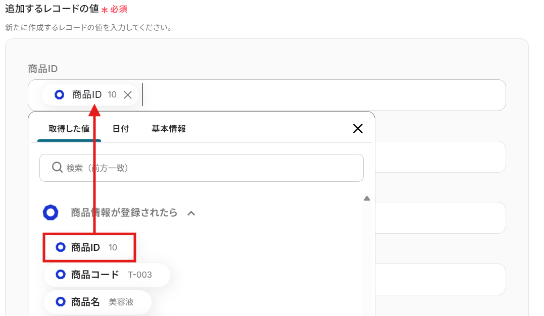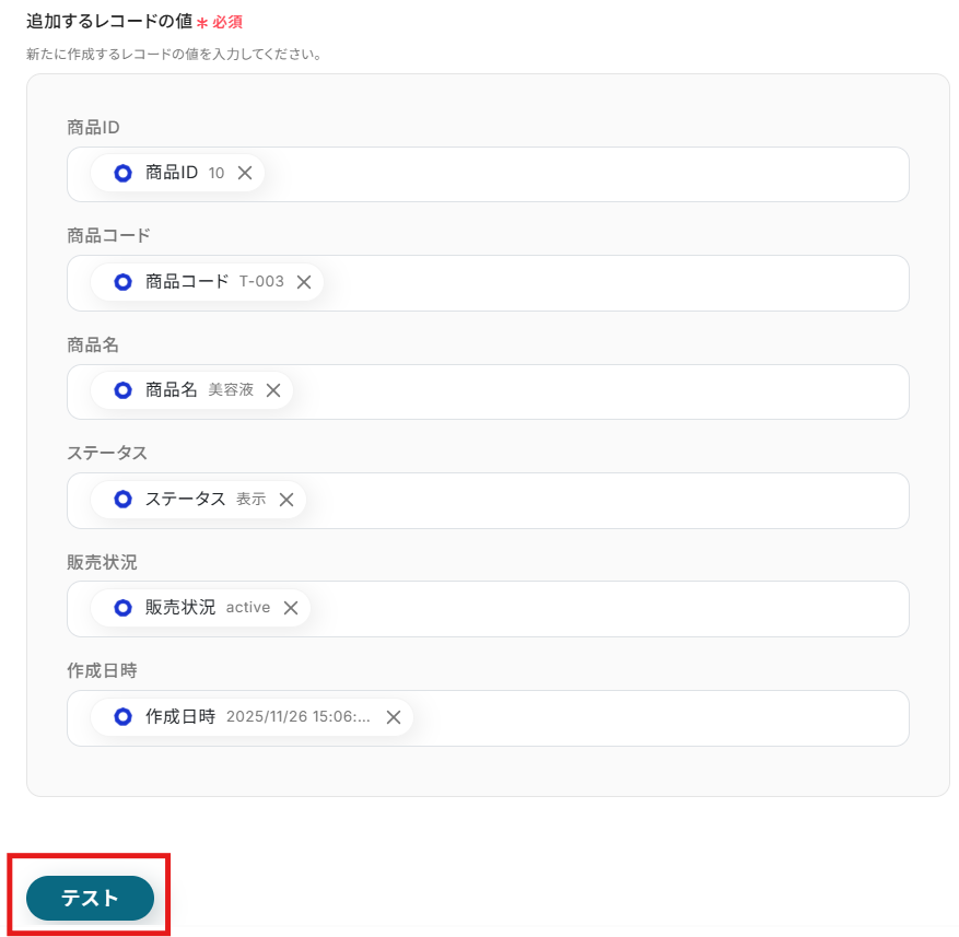 - 最後に、オペレーションでGoogle スプレッドシートの「レコードを追加する」アクションを設定し、ecforceから取得した商品情報を指定のシートに追記します。