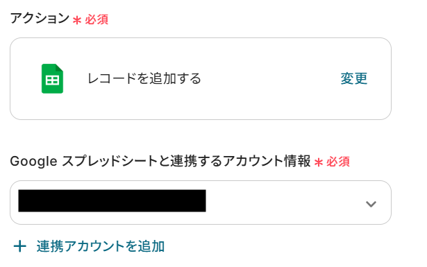 ecforceと同様に、ステップ1でマイアプリ連携したGoogle スプレッドシートのアカウント情報が自動で表示されます。