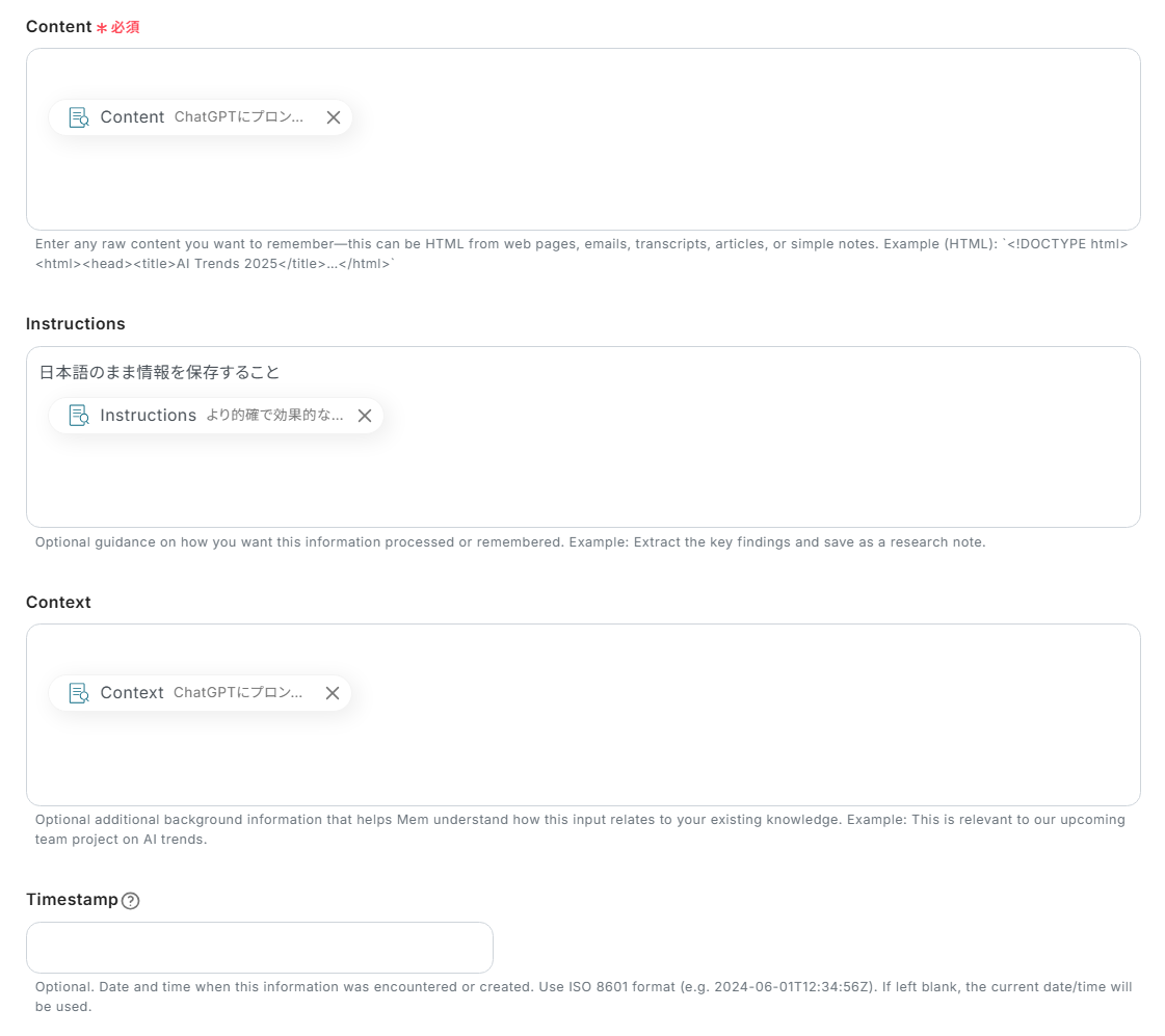 「API接続設定」ではMemに情報を保存する設定を行います。 下記のように各項目に1つ前のステップで取得した値が設定されていることを確認してください。 また、Memに保存時に英文に翻訳されてしまう事象が発生することがあるため、Instructionsに「日本語のまま情報を保存すること」の注意書きの追加をお願いします。