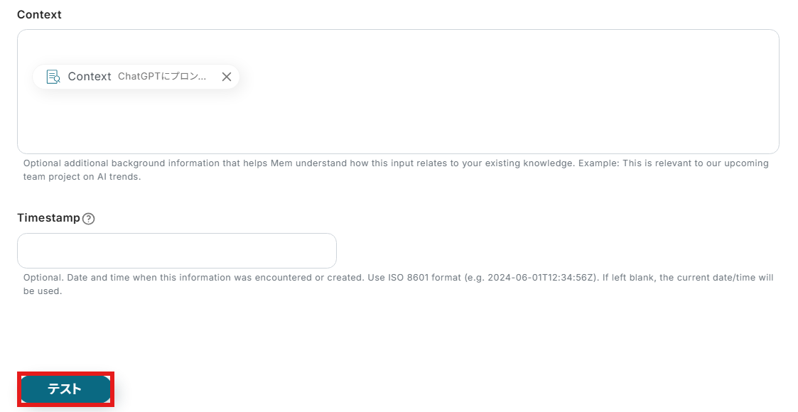 各設定が完了したらテストボタンをクリックしましょう。(※実際にMemに書き込みが行われるため、必要に応じてメンバーに周知などを行ってください。)