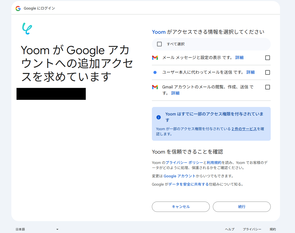 アクセス権限の確認画面が表示されるので、Yoomがアクセスできる情報として「すべて選択」にチェックを入れてください。 最後に「続行」をクリックして連携を完了させましょう。