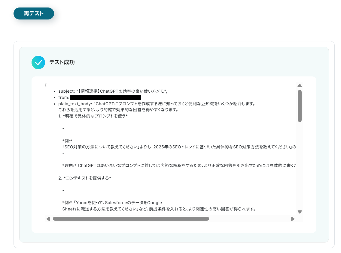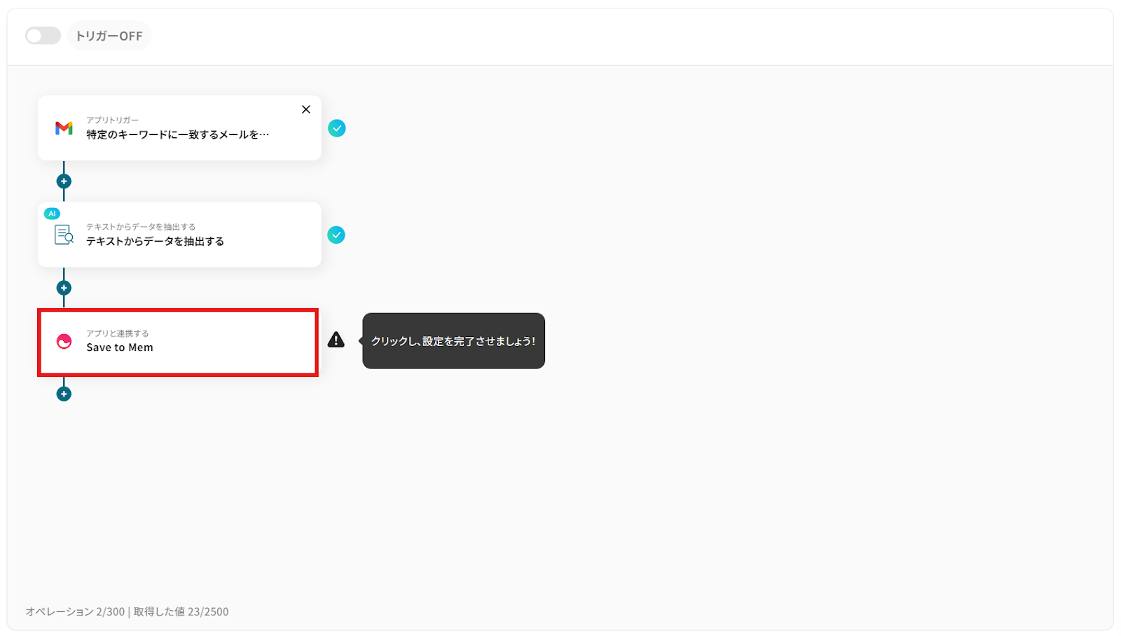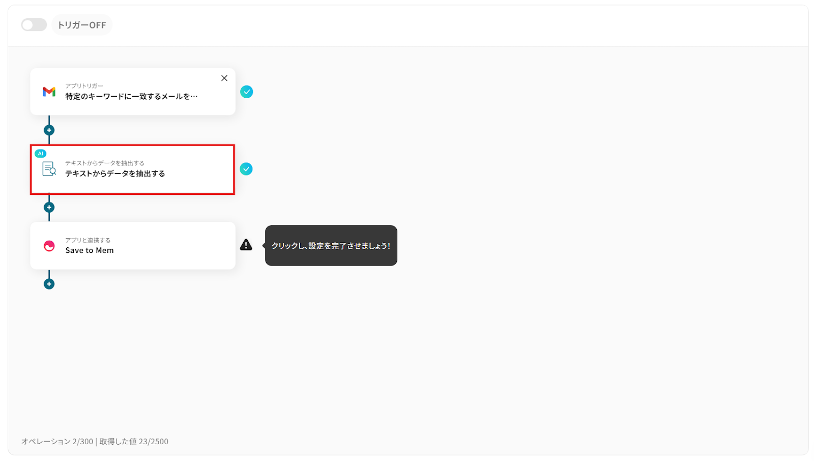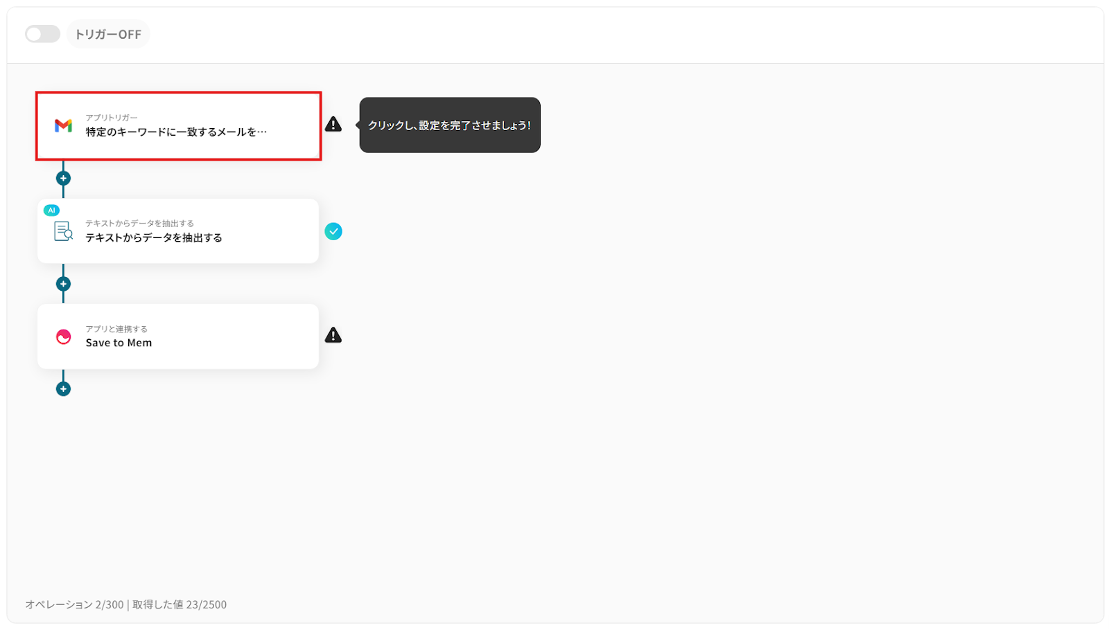 AI機能の「テキストからデータを抽出する」オペレーションでは、Gmailで受信したメール本文の中から、抽出したい項目を任意で設定してください。 Memの「Save to Mem」オペレーションでは、保存する内容に、前のステップで抽出したメールの件名や本文などの情報を変数として埋め込むことが可能です。 ■注意事項