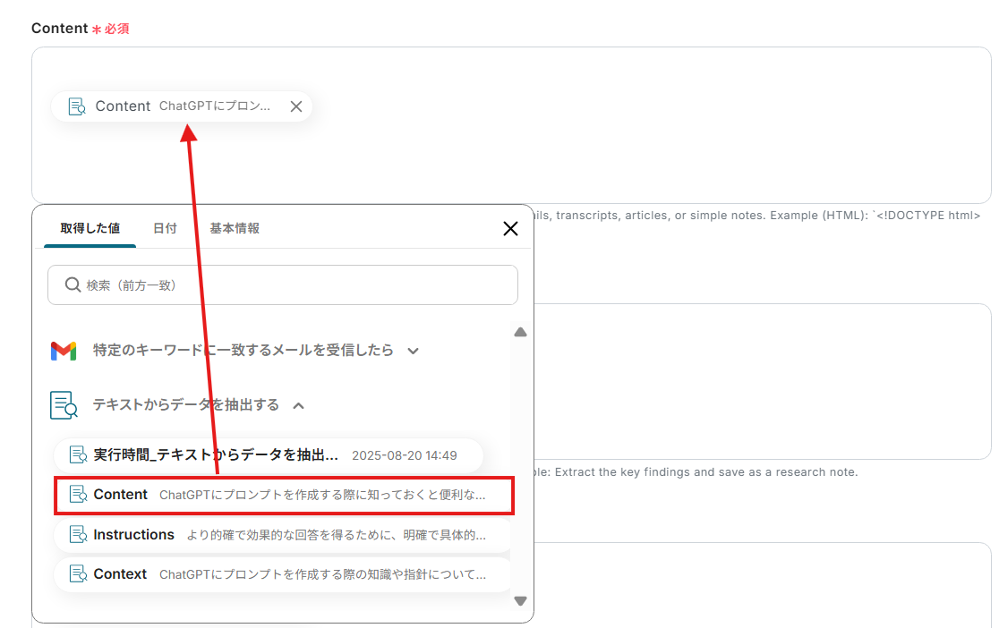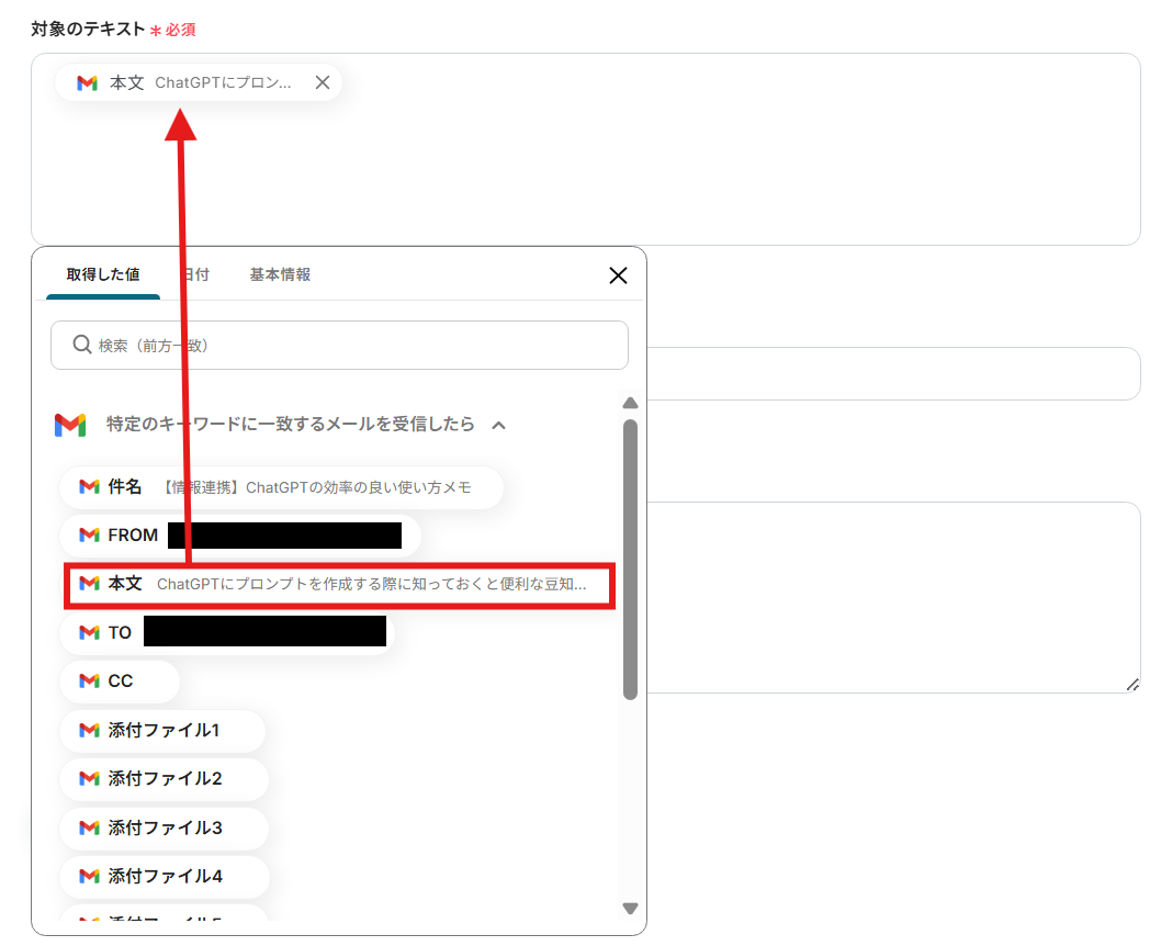 対象のテキスト:1つ前のステップで取得したメールの本文が設定されていることを確認してください。プルダウンより取得済みの情報を設定することも可能です。 取得した値を活用することで、固定値ではなく、トリガーが実行されるたびに最新の情報が反映できます。