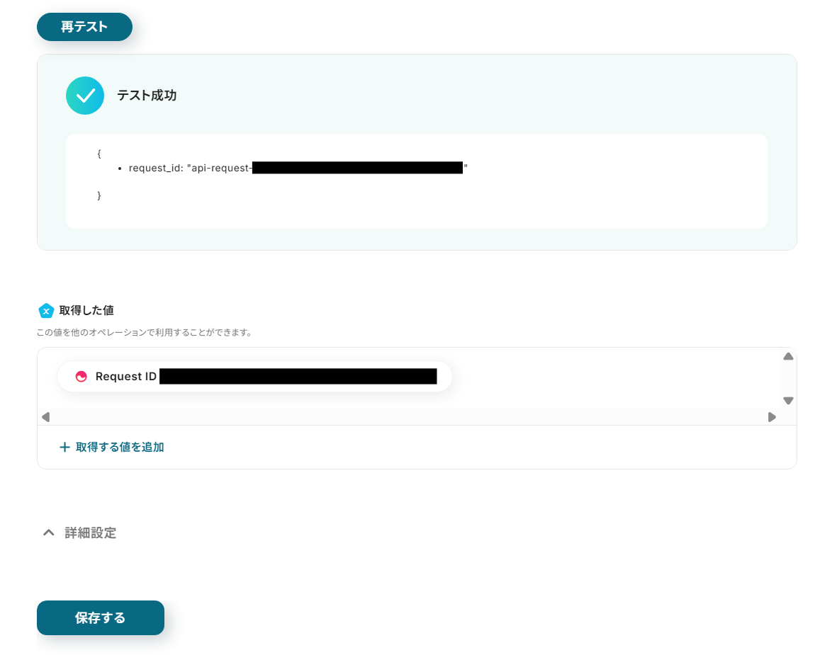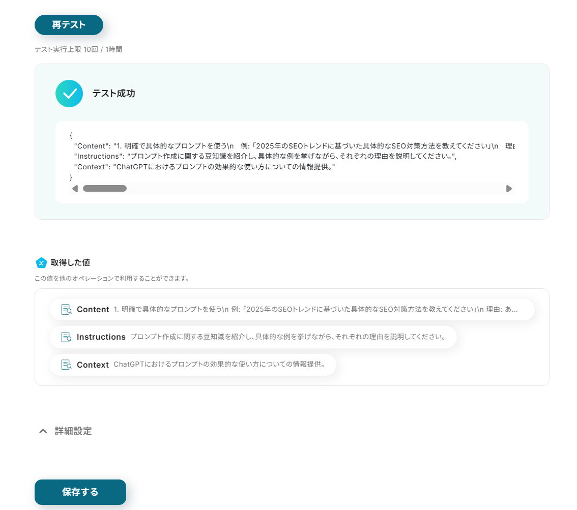 下記のようにテスト成功が表示されていれば設定完了となります。AIによる抽出内容に問題がなければ画面下の保存するボタンをクリックし、テキストからデータを抽出する設定を完了させてください。