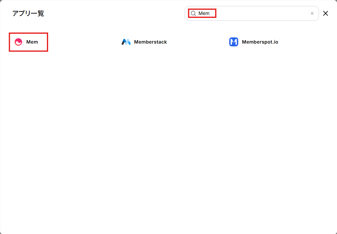 検索ボックスにMemと入力し、Memのアイコンをクリックします。