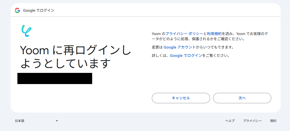 選択したGoogleアカウントでログイン確認画面が表示されるので、「次へ」をクリックします。