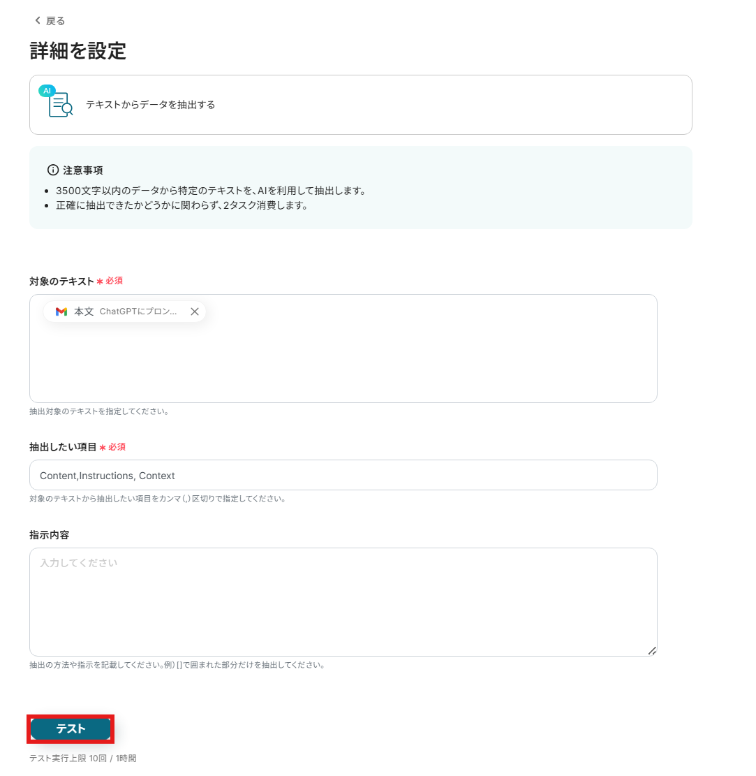 抽出したい項目:デフォルト値の「Content,Instructions, Context」が設定されていることを確認しましょう。