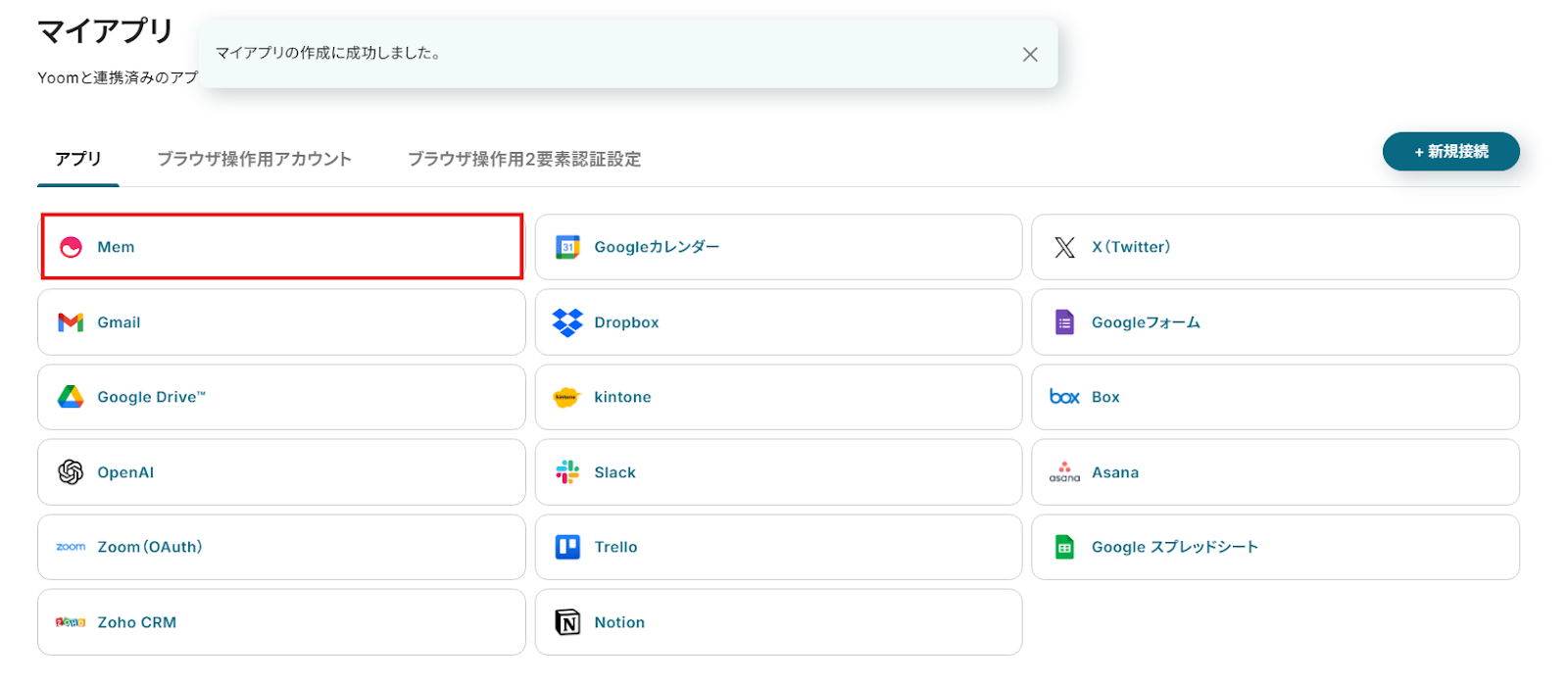 アプリ:マイアプリ連携をした「Mem」が反映されていることを確認しましょう。