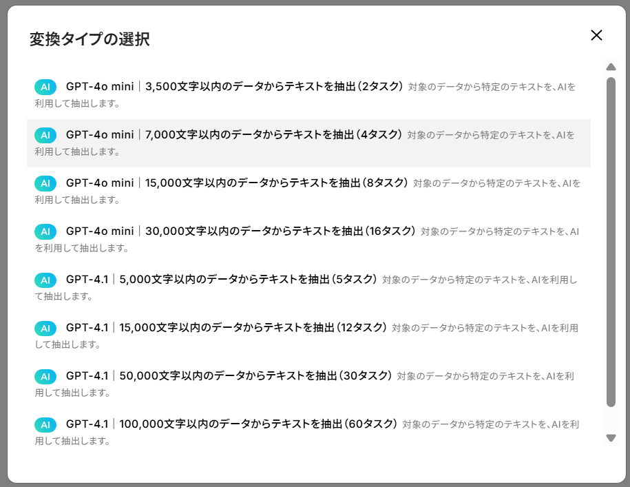 変換タイプ:プルダウンより使用文字数に適したモデルを選択してください。(文字数やモデルの性能が上がるごとに使用タスクが増加します。できるだけ少なめの設定を選んでいただく方がタスクの消費を抑えられます。 プラン によってタスク数の上限が異なりますので、ご注意ください。)