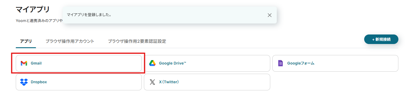 アプリ:マイアプリ連携をした「Gmail」が反映されていることを確認しましょう。