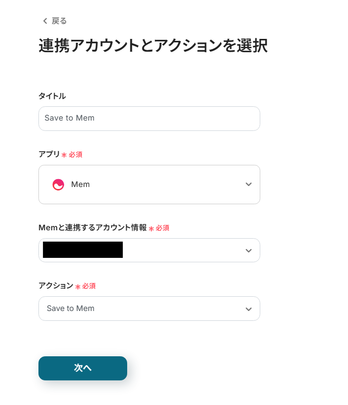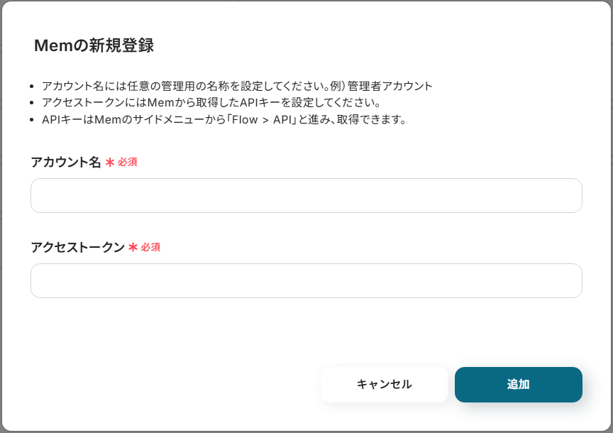 Memと連携するアカウント情報:フローと紐づけるアカウントを選択してください。対象のアカウントがリストに表示されていないときは「アカウントを追加」から追加が可能です。