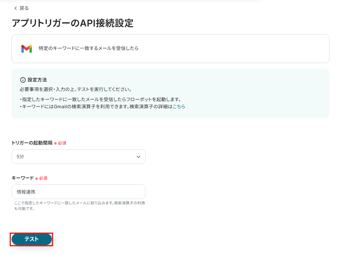 キーワード:対象のメールだと判断するためのキーワードを設定してください。 この後の設定のテストに使用するため、Gmailに設定したキーワードを含むメールを送信しておきましょう。