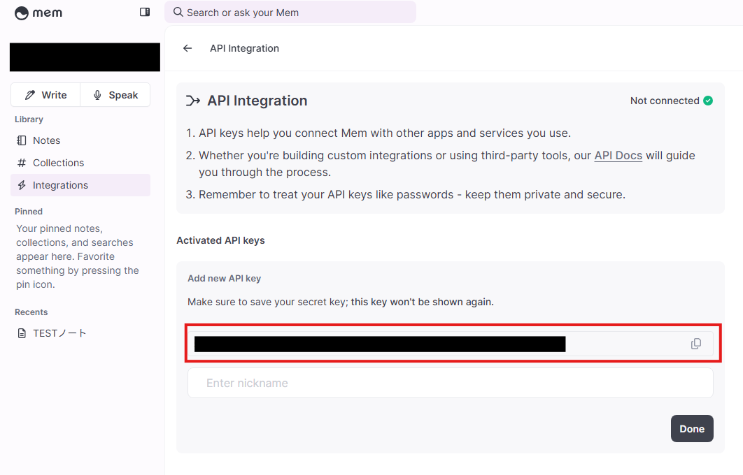※APIキーはMemにログインし、サイドバーのIntegrationsから確認が可能です。
