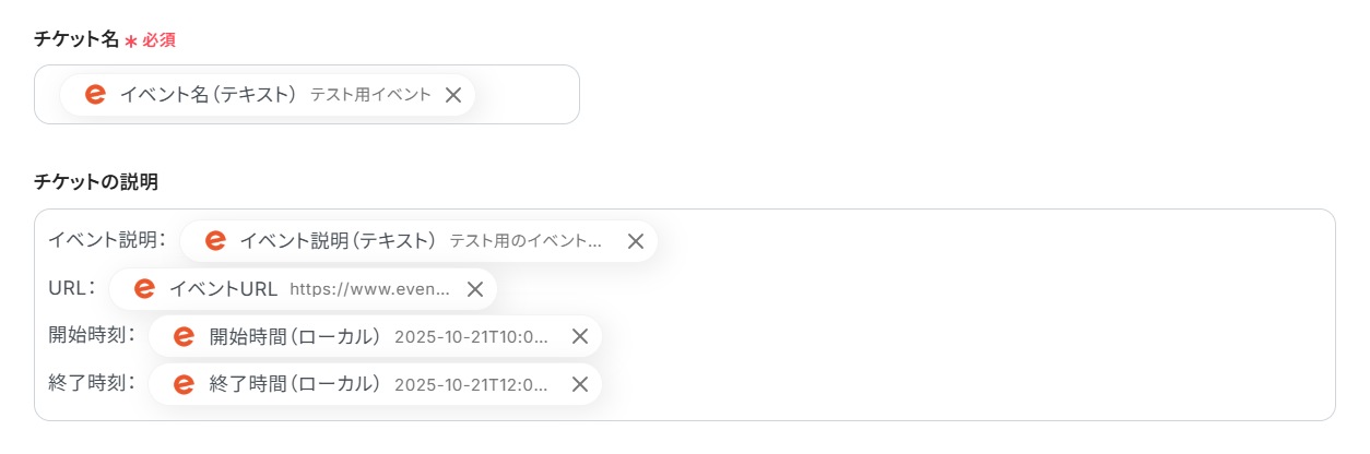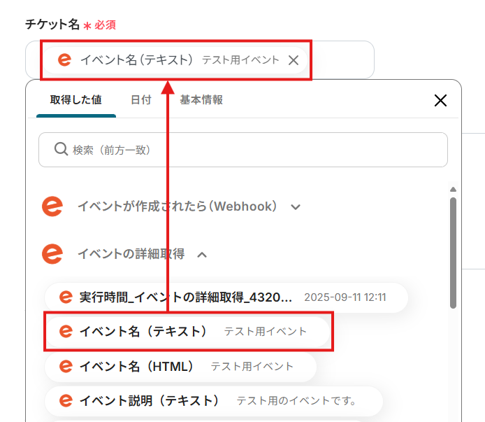 - テストに成功すると、作成したイベントのIDやURLなどが「取得した値」に追加されます。