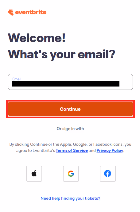 Eventbriteのログイン画面に移動するので、メールアドレスを入力し「Continue」をクリックしてください。