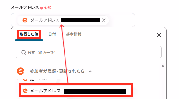 「メールアドレス」は、取得した値から選択してください。