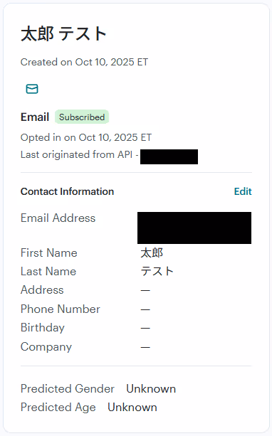 また、実際オーディエンスにコンタクトが追加されるので、Mailchimpを確認してみましょう。