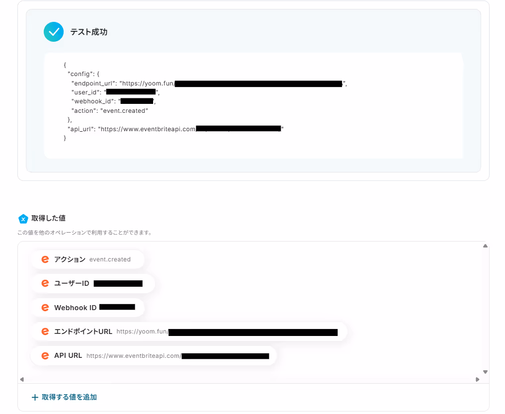 4.次はEventbriteで、登録したWebhookが正常にトリガーアクションを検知できるかのテストを行います。