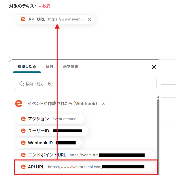 「対象のテキスト」は、入力欄をクリックして表示される取得した値から選択してください。