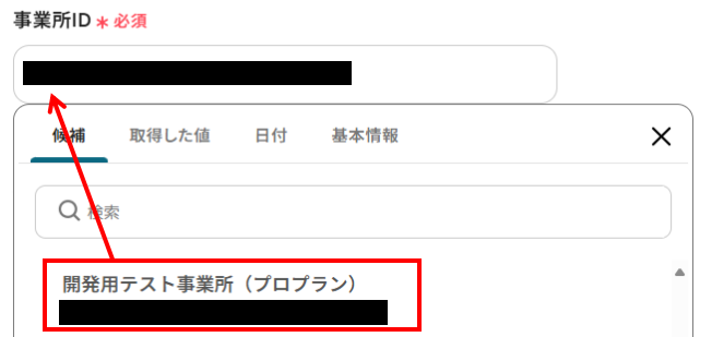 「事業所ID」は、入力欄をクリックすると候補が表示されるので対象の事業者IDを選んでください。
