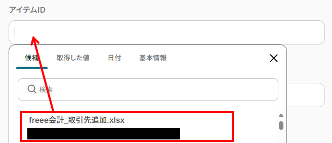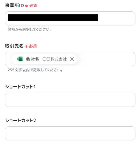 ・取引先ID:⑤の取引先検索で取得した取引先IDを埋め込みます。