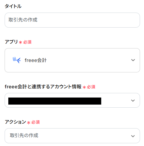⑤+マークを押し、アプリと連携するオペレーションからfreee会計、取引先の検索アクションと選択し、以下の設定を行ってテスト・保存します。