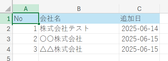 今回は、下記のようなMicrosoft Excelファイルを用意しました。前日に追加した複数レコード(今回はNo.2とNo.3)を取得していくような内容で設定していく予定です。