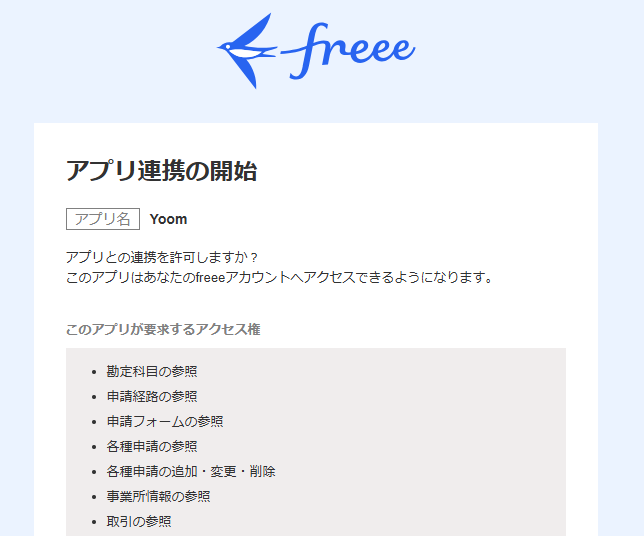 Yoomがfreee会計にアクセスして良いか確認画面になります。画面最下部の「許可する」を押して進みましょう。