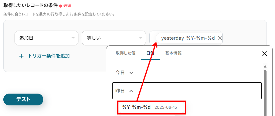 今回は、前日の追加日であるデータを条件にしたいので、下記のように設定しました。