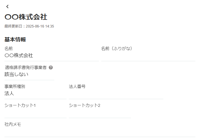 「取引先名」の入力欄をクリックすると、下記のようなアウトプットが表示されるので先ほど取得した会社名を選択しましょう。