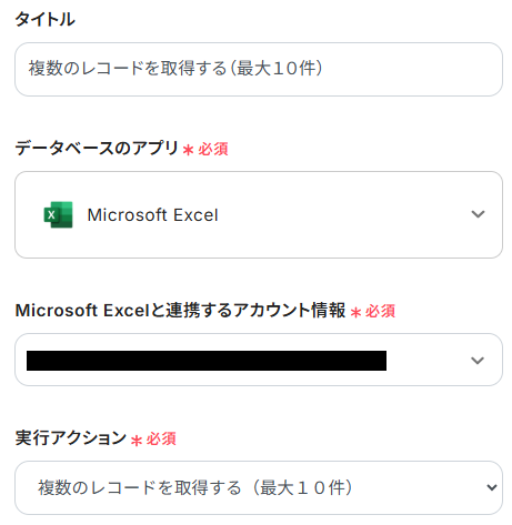 実行アクションは、テンプレート通り「複数のレコードを取得する(最大10件)」のままで問題ありません。