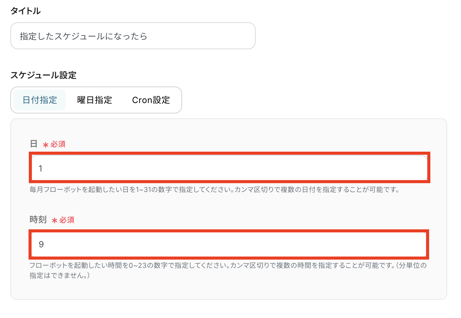 テンプレートでは「毎月1日9時」にフローボットが起動される設定となっています。