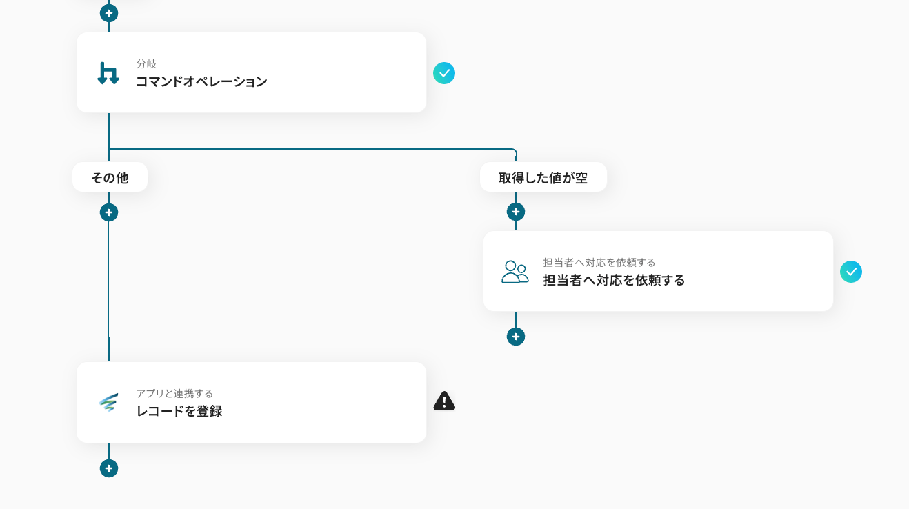例えば、取得した値の一つが空であった場合は担当者に確認してもらうようにフローを構成することも可能です。