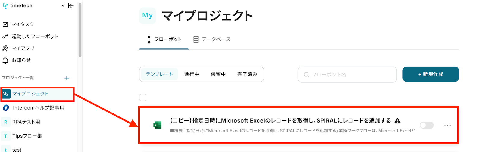 左側にあるメニューの「マイプロジェクト」から、コピーしたテンプレートを開きます。