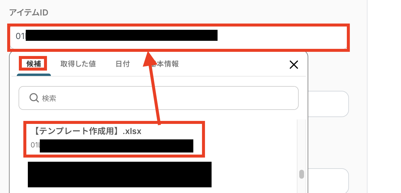 「ドライブID」と「アイテムID」と「シート名」は候補から選択できます。