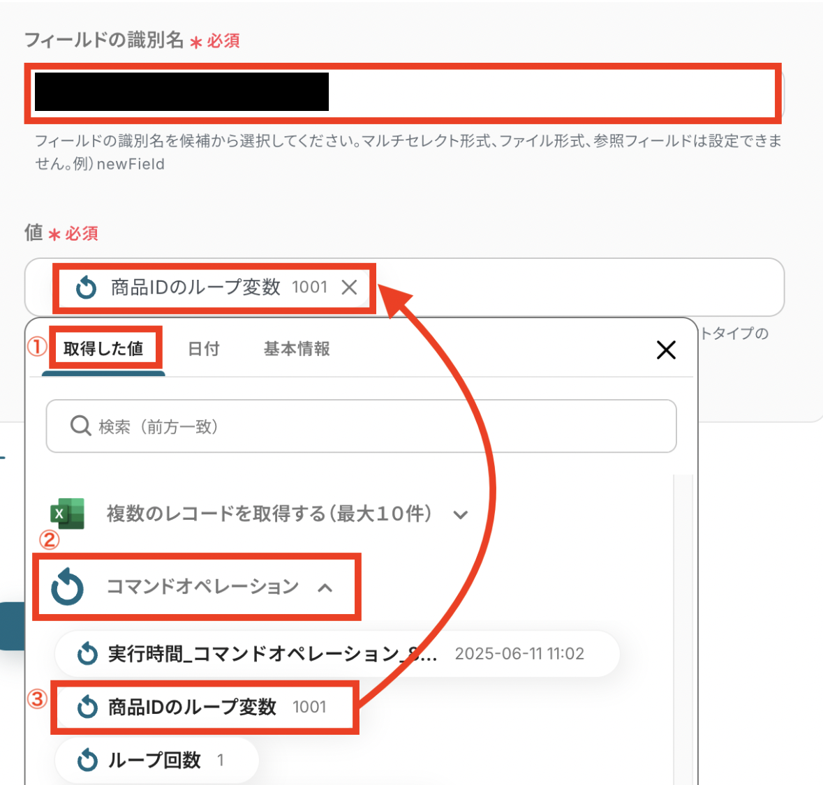 「取得した値」に「レコードID」が表示されていればテスト成功です。
