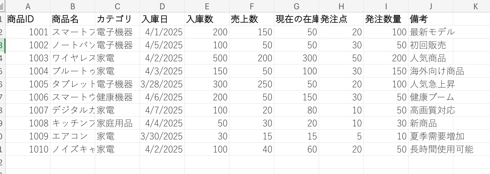 今回は「在庫管理データをSPIRALに自動登録」することを想定し、在庫管理シートをMicrosoft Excelにテスト用で作成しました!