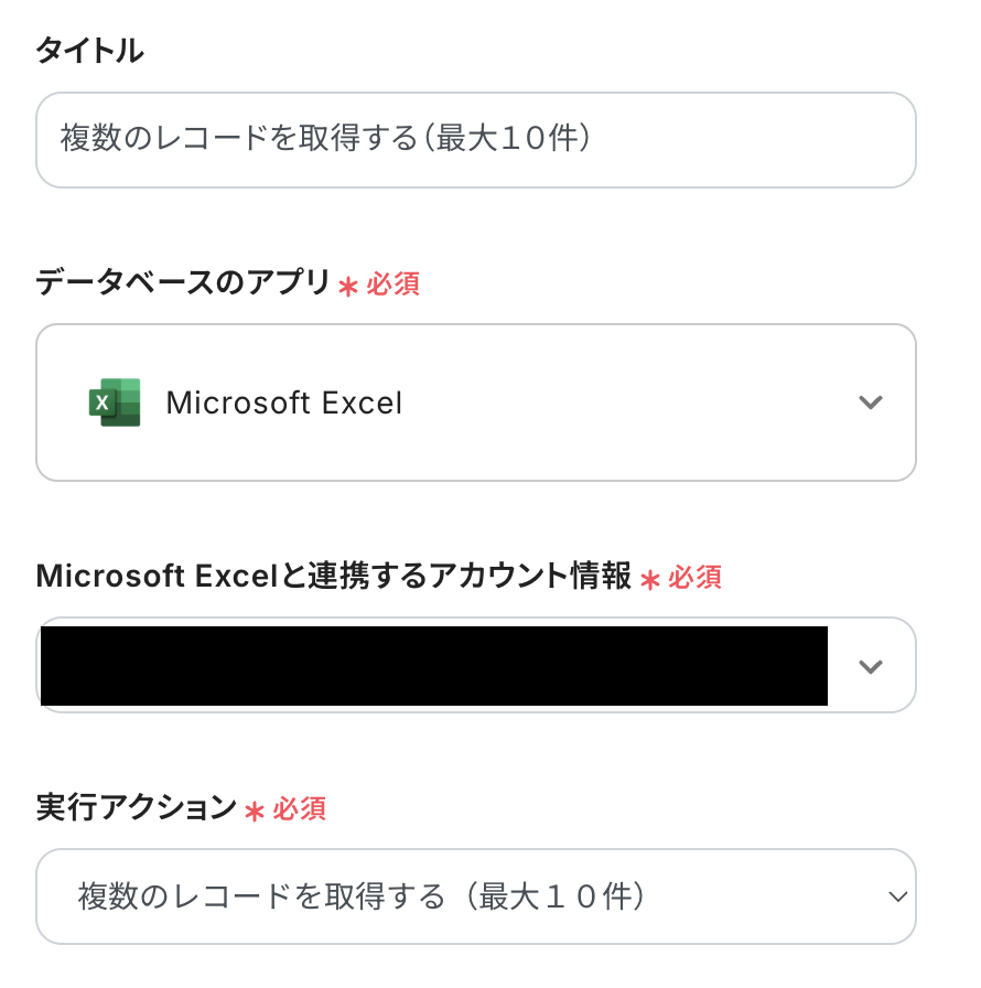 今回はMicrosoft Excelに入力されているレコード全てのデータを取得したいので、写真のように設定します。