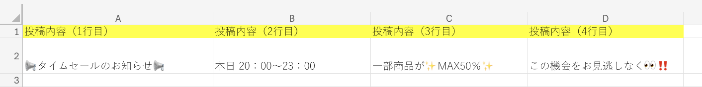 設定を進める前に、X(Twitter)に投稿するポスト内容をまとめたMicrosoft Excelのシートを用意しておきましょう。